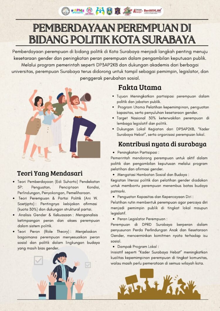 Tahukah kamu? Pemberdayaan perempuan di bidang politik menjadi kunci penting menuju kesetaraan gender dan terciptanya kebijakan publik yang lebih inklusif. Di Kota Surabaya, berbagai upaya terus dilakukan untuk meningkatkan partisipasi perempuan sebagai pemimpin, legislator, dan pengambil keputusan.