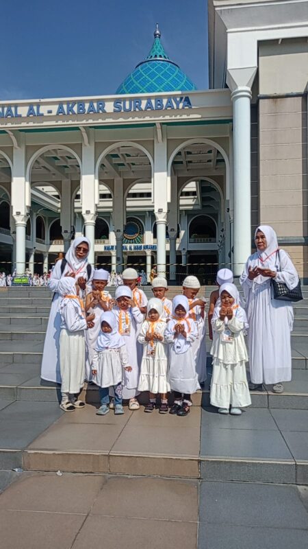 Bertempat di lingkungan Masjid Al Akbar, salah satu ikon keagamaan terbesar di Surabaya, anak-anak TK Kartini mendapatkan kesempatan istimewa untuk mengikuti simulasi manasik haji dengan suasana yang khusyuk dan penuh semangat. Dengan bimbingan guru dan pendamping, anak-anak mengenakan pakaian ihram dan mengikuti rangkaian manasik, mulai dari niat haji, tawaf mengelilingi Ka’bah mini, sa’i antara Bukit Shafa dan Marwah, wukuf di Arafah, hingga melempar jumrah secara simbolis.